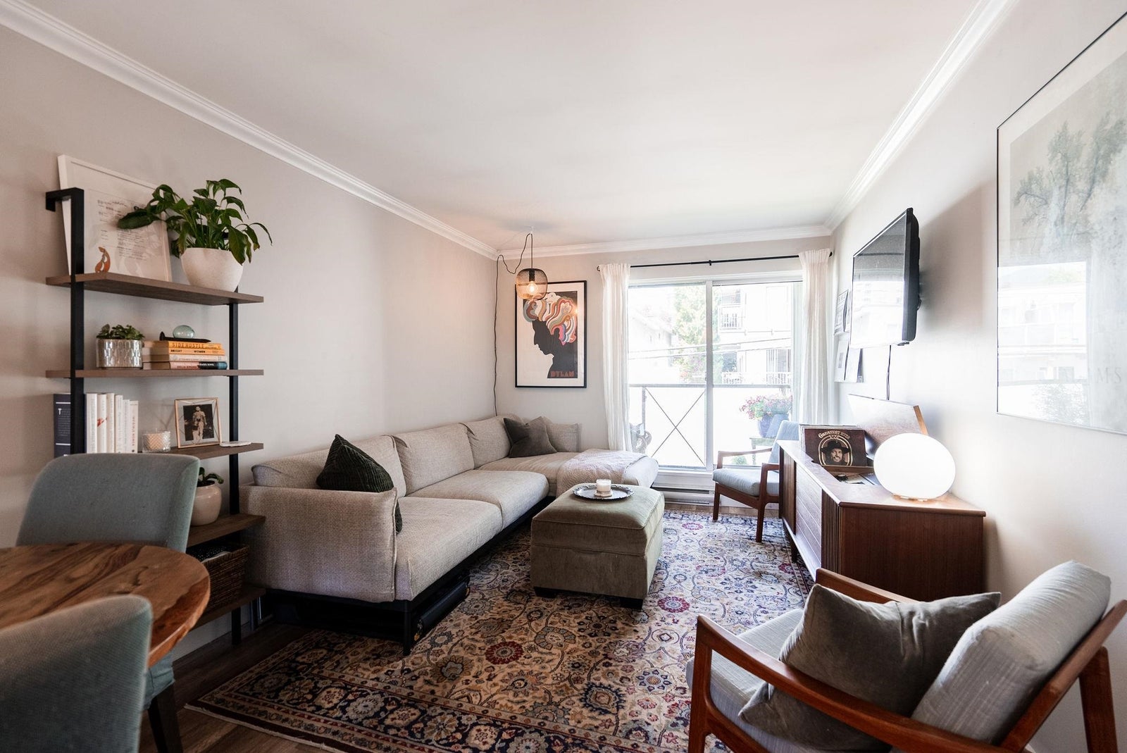 Fully renovated TOP-FLOOR 1 bed, 1 bath home in the heart of vibrant Lower Lonsdale! Located in RAINSCREENED Harbourside Terrace with your own PRIVATE ENTRANCE. This contemporary home boasts an open-concept layout with spacious living and dining areas, designated workspace, beautiful crown moulding and ample storage throughout. The kitchen features stainless steel appliances, updated countertops, modern cabinetry, and a sleek backsplash. Enjoy the comfort of IN-SUITE LAUNDRY and a generous primary bedroom with space for a king bed. Step outside to a stunning common rooftop deck with sweeping ocean and city views—perfect for relaxing or entertaining. Just a short walk to Lonsdale's best restaurants, cafes, breweries, and the Shipyards. Pets and rentals allowed. OPEN HOUSE MAY 10, 2-4PM